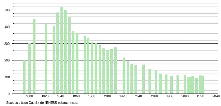 L'évolution du nombre d'habitants est connue à travers les recensements de la population effectués dans la commune depuis 1793. Pour les communes de moins de 10 000 habitants, une enquête de recensement portant sur toute la population est réalisée tous les cinq ans, les populations de référence des années intermédiaires étant quant à elles estimées par interpolation ou extrapolation[17]. Pour la commune, le premier recensement exhaustif entrant dans le cadre du nouveau dispositif a été réalisé en 2004[18].