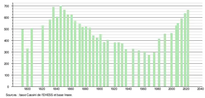 L'évolution du nombre d'habitants est connue à travers les recensements de la population effectués dans la commune depuis 1793. Pour les communes de moins de 10 000 habitants, une enquête de recensement portant sur toute la population est réalisée tous les cinq ans, les populations de référence des années intermédiaires étant quant à elles estimées par interpolation ou extrapolation[27]. Pour la commune, le premier recensement exhaustif entrant dans le cadre du nouveau dispositif a été réalisé en 2008[28].