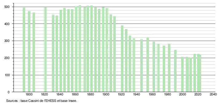 L'évolution du nombre d'habitants est connue à travers les recensements de la population effectués dans la commune depuis 1793. Pour les communes de moins de 10 000 habitants, une enquête de recensement portant sur toute la population est réalisée tous les cinq ans, les populations de référence des années intermédiaires étant quant à elles estimées par interpolation ou extrapolation[19]. Pour la commune, le premier recensement exhaustif entrant dans le cadre du nouveau dispositif a été réalisé en 2005[20].