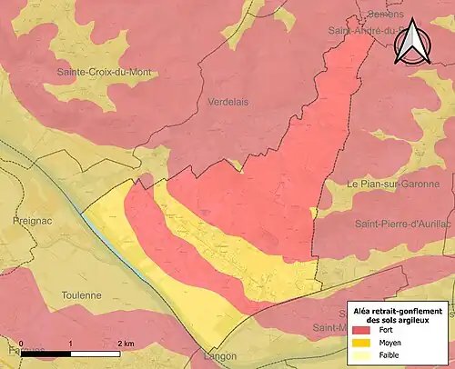 Le retrait-gonflement des sols argileux est susceptible d'engendrer des dommages importants aux bâtiments en cas d’alternance de périodes de sécheresse et de pluie. 99,3 % de la superficie communale est en aléa moyen ou fort (67,4 % au niveau départemental et 48,5 % au niveau national). Sur les 817 bâtiments dénombrés sur la commune en 2019, 817 sont en aléa moyen ou fort, soit 100 %, à comparer aux 84 % au niveau départemental et 54 % au niveau national. Une cartographie de l'exposition du territoire national au retrait gonflement des sols argileux est disponible sur le site du BRGM[19],[Carte 2].
