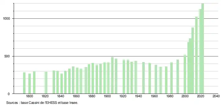 L'évolution du nombre d'habitants est connue à travers les recensements de la population effectués dans la commune depuis 1793. Pour les communes de moins de 10 000 habitants, une enquête de recensement portant sur toute la population est réalisée tous les cinq ans, les populations de référence des années intermédiaires étant quant à elles estimées par interpolation ou extrapolation[17]. Pour la commune, le premier recensement exhaustif entrant dans le cadre du nouveau dispositif a été réalisé en 2004[18].