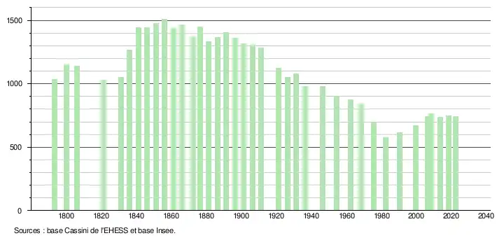 L'évolution du nombre d'habitants est connue à travers les recensements de la population effectués dans la commune depuis 1793. Pour les communes de moins de 10 000 habitants, une enquête de recensement portant sur toute la population est réalisée tous les cinq ans, les populations de référence des années intermédiaires étant quant à elles estimées par interpolation ou extrapolation[18]. Pour la commune, le premier recensement exhaustif entrant dans le cadre du nouveau dispositif a été réalisé en 2008[19].