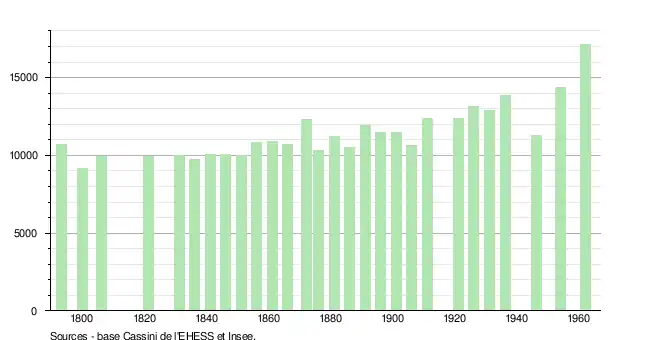 ↑ Par convention dans Wikipédia, le principe a été retenu de n’afficher dans le tableau des recensements et le graphique, pour les populations de référence postérieures à 1999, que les populations correspondant à une enquête exhaustive de recensement pour les communes de moins de 10000habitants, et que les populations des années 2006, 2011, 2016, etc. pour les communes de plus de 10000habitants, ainsi que la dernière population de référence publiée par l’Insee pour l'ensemble des communes.