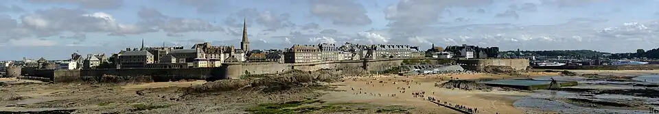 Reliée aux falaises de Paramé par un cordon dunaire bordé d'une plage longue de quatre kilomètres s'étendant jusqu'à celle du Minihic en Rothéneuf (cordon renforcé par une digue et loti en villas à la fin du XIXesiècle), ce tombolo protégeait une baie intérieure battue par les marées, permettant ainsi la création du port. Les endiguements progressifs depuis le XVIIIesiècle permirent l'extension de quartiers à partir de la gare au XIXesiècle. L'urbanisation s'est poursuivie depuis les années 1960 sur les plateaux de Paramé à l'est et de Saint-Servan au sud. Les trois villes ont été réunies en 1967 et l'agglomération s'étend ainsi jusqu'à la pointe de la Varde et au Havre de Rothéneuf au nord-est et le long de la ria de la Rance au sud.
