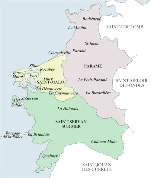 Quatre anciennes communes ont été absorbées par Saint-Malo et restent présentes dans la toponymie locale: Saint-Servan (souvent dit Saint-Servan-sur-Mer), Paramé, Rothéneuf, Saint-Ideuc[33].