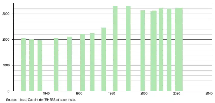L'évolution du nombre d'habitants est connue à travers les recensements de la population effectués dans la commune depuis 1926. Pour les communes de moins de 10000habitants, une enquête de recensement portant sur toute la population est réalisée tous les cinqans, les populations de référence des années intermédiaires étant quant à elles estimées par interpolation ou extrapolation[21]. Pour la commune, le premier recensement exhaustif entrant dans le cadre du nouveau dispositif a été réalisé en 2005[22].