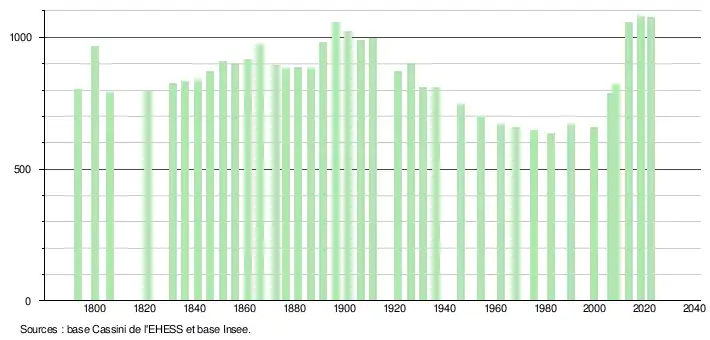 L'évolution du nombre d'habitants est connue à travers les recensements de la population effectués dans la commune depuis 1793. Pour les communes de moins de 10 000 habitants, une enquête de recensement portant sur toute la population est réalisée tous les cinq ans, les populations de référence des années intermédiaires étant quant à elles estimées par interpolation ou extrapolation[27]. Pour la commune, le premier recensement exhaustif entrant dans le cadre du nouveau dispositif a été réalisé en 2008[28].