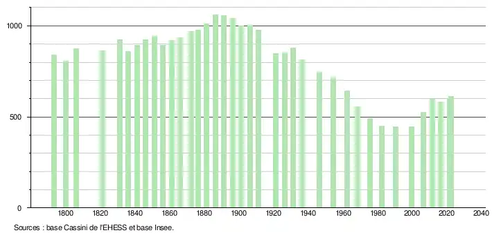 L'évolution du nombre d'habitants est connue à travers les recensements de la population effectués dans la commune depuis 1793. Pour les communes de moins de 10 000 habitants, une enquête de recensement portant sur toute la population est réalisée tous les cinq ans, les populations de référence des années intermédiaires étant quant à elles estimées par interpolation ou extrapolation[21]. Pour la commune, le premier recensement exhaustif entrant dans le cadre du nouveau dispositif a été réalisé en 2006[22].