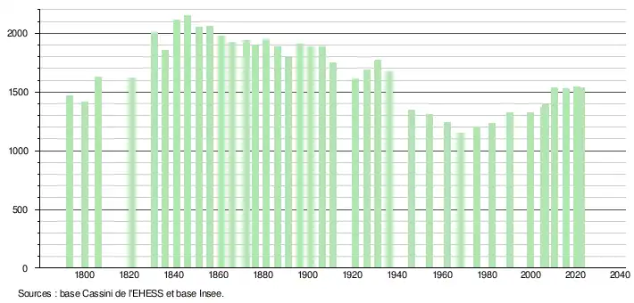 L'évolution du nombre d'habitants est connue à travers les recensements de la population effectués dans la commune depuis 1793. Pour les communes de moins de 10 000 habitants, une enquête de recensement portant sur toute la population est réalisée tous les cinq ans, les populations de référence des années intermédiaires étant quant à elles estimées par interpolation ou extrapolation[20]. Pour la commune, le premier recensement exhaustif entrant dans le cadre du nouveau dispositif a été réalisé en 2005[21].