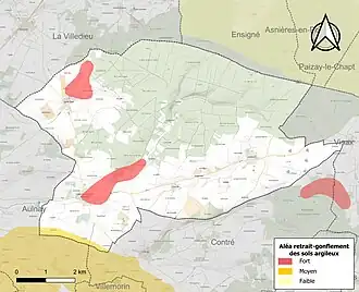 Le retrait-gonflement des sols argileux est susceptible d'engendrer des dommages importants aux bâtiments en cas d’alternance de périodes de sécheresse et de pluie. 5,2 % de la superficie communale est en aléa moyen ou fort (54,2 % au niveau départemental et 48,5 % au niveau national). Sur les 204 bâtiments dénombrés sur la commune en 2019, 62 sont en aléa moyen ou fort, soit 30 %, à comparer aux 57 % au niveau départemental et 54 % au niveau national. Une cartographie de l'exposition du territoire national au retrait gonflement des sols argileux est disponible sur le site du BRGM[15],[Carte 2].