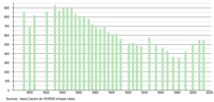 - ↑ Par convention dans Wikipédia, le principe a été retenu de n’afficher dans le tableau des recensements et le graphique, pour les populations légales postérieures à 1999, que les populations correspondant à une enquête exhaustive de recensement pour les communes de moins de 10 000 habitants, et que les populations des années 2006, 2011, 2016, etc. pour les communes de plus de 10 000 habitants, ainsi que la dernière population légale publiée par l’Insee pour l'ensemble des communes.