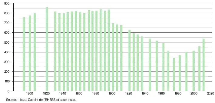 - ↑ Dans le tableau des recensements et le graphique, par convention dans Wikipédia, le principe a été retenu, pour les populations légales postérieures à 1999 de n’afficher dans le tableau des recensements et le graphique que les populations correspondant à l'année 2006, première population légale publiée calculée conformément aux concepts définis dans le décret no 2003-485 du 5 juin 2003, et les années correspondant à une enquête exhaustive de recensement pour les communes de moins de 10 000 habitants, ainsi que la dernière population légale publiée par l’Insee.