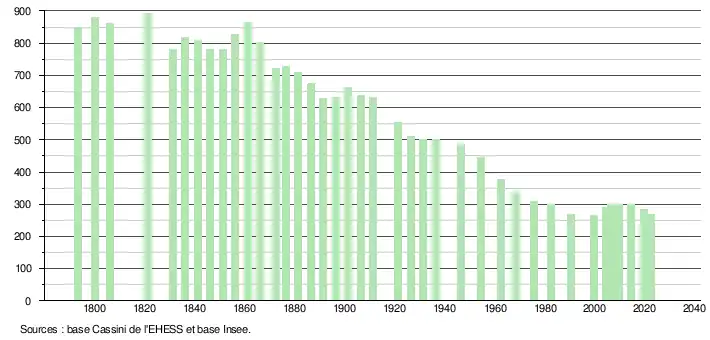 L'évolution du nombre d'habitants est connue à travers les recensements de la population effectués dans la commune depuis 1793. Pour les communes de moins de 10 000 habitants, une enquête de recensement portant sur toute la population est réalisée tous les cinq ans, les populations de référence des années intermédiaires étant quant à elles estimées par interpolation ou extrapolation[12]. Pour la commune, le premier recensement exhaustif entrant dans le cadre du nouveau dispositif a été réalisé en 2004[13].