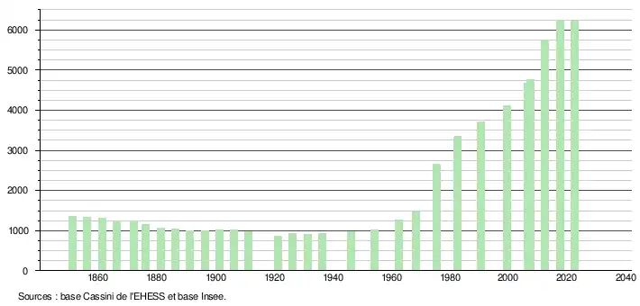 L'évolution du nombre d'habitants est connue à travers les recensements de la population effectués dans la commune depuis 1851. Pour les communes de moins de 10 000 habitants, une enquête de recensement portant sur toute la population est réalisée tous les cinq ans, les populations de référence des années intermédiaires étant quant à elles estimées par interpolation ou extrapolation[22]. Pour la commune, le premier recensement exhaustif entrant dans le cadre du nouveau dispositif a été réalisé en 2007[23].