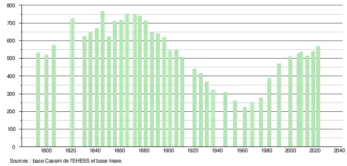 L'évolution du nombre d'habitants est connue à travers les recensements de la population effectués dans la commune depuis 1793. Pour les communes de moins de 10 000 habitants, une enquête de recensement portant sur toute la population est réalisée tous les cinq ans, les populations de référence des années intermédiaires étant quant à elles estimées par interpolation ou extrapolation[13]. Pour la commune, le premier recensement exhaustif entrant dans le cadre du nouveau dispositif a été réalisé en 2008[14].