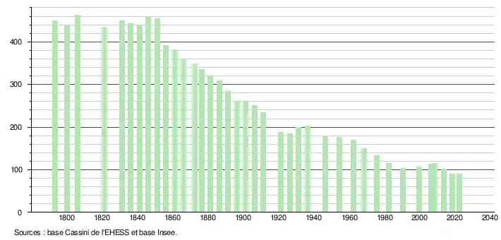 L'évolution du nombre d'habitants est connue à travers les recensements de la population effectués dans la commune depuis 1793. Pour les communes de moins de 10 000 habitants, une enquête de recensement portant sur toute la population est réalisée tous les cinq ans, les populations de référence des années intermédiaires étant quant à elles estimées par interpolation ou extrapolation[18]. Pour la commune, le premier recensement exhaustif entrant dans le cadre du nouveau dispositif a été réalisé en 2008[19].