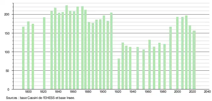 L'évolution du nombre d'habitants est connue à travers les recensements de la population effectués dans la commune depuis 1793. Pour les communes de moins de 10 000 habitants, une enquête de recensement portant sur toute la population est réalisée tous les cinq ans, les populations de référence des années intermédiaires étant quant à elles estimées par interpolation ou extrapolation[26]. Pour la commune, le premier recensement exhaustif entrant dans le cadre du nouveau dispositif a été réalisé en 2006[27].