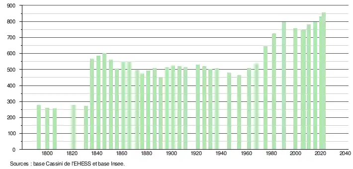 L'évolution du nombre d'habitants est connue à travers les recensements de la population effectués dans la commune depuis 1793. Pour les communes de moins de 10 000 habitants, une enquête de recensement portant sur toute la population est réalisée tous les cinq ans, les populations de référence des années intermédiaires étant quant à elles estimées par interpolation ou extrapolation[22]. Pour la commune, le premier recensement exhaustif entrant dans le cadre du nouveau dispositif a été réalisé en 2005[23].