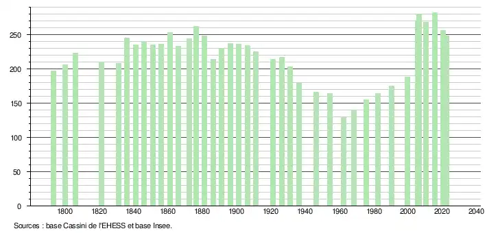 L'évolution du nombre d'habitants est connue à travers les recensements de la population effectués dans la commune depuis 1793. Pour les communes de moins de 10 000 habitants, une enquête de recensement portant sur toute la population est réalisée tous les cinq ans, les populations de référence des années intermédiaires étant quant à elles estimées par interpolation ou extrapolation[59]. Pour la commune, le premier recensement exhaustif entrant dans le cadre du nouveau dispositif a été réalisé en 2005[60].
