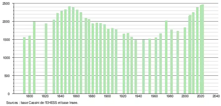 L'évolution du nombre d'habitants est connue à travers les recensements de la population effectués dans la commune depuis 1793. Pour les communes de moins de 10 000 habitants, une enquête de recensement portant sur toute la population est réalisée tous les cinq ans, les populations de référence des années intermédiaires étant quant à elles estimées par interpolation ou extrapolation[26]. Pour la commune, le premier recensement exhaustif entrant dans le cadre du nouveau dispositif a été réalisé en 2005[27].