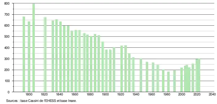L'évolution du nombre d'habitants est connue à travers les recensements de la population effectués dans la commune depuis 1793. Pour les communes de moins de 10 000 habitants, une enquête de recensement portant sur toute la population est réalisée tous les cinq ans, les populations de référence des années intermédiaires étant quant à elles estimées par interpolation ou extrapolation[17]. Pour la commune, le premier recensement exhaustif entrant dans le cadre du nouveau dispositif a été réalisé en 2004[18].