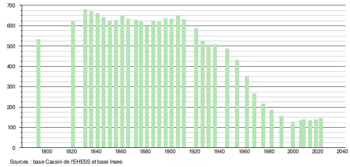L'évolution du nombre d'habitants est connue à travers les recensements de la population effectués dans la commune depuis 1793. Pour les communes de moins de 10 000 habitants, une enquête de recensement portant sur toute la population est réalisée tous les cinq ans, les populations de référence des années intermédiaires étant quant à elles estimées par interpolation ou extrapolation[22]. Pour la commune, le premier recensement exhaustif entrant dans le cadre du nouveau dispositif a été réalisé en 2008[23].