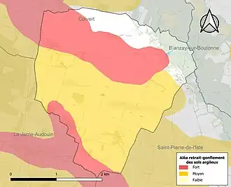 Le retrait-gonflement des sols argileux est susceptible d'engendrer des dommages importants aux bâtiments en cas d’alternance de périodes de sécheresse et de pluie. 84 % de la superficie communale est en aléa moyen ou fort (54,2 % au niveau départemental et 48,5 % au niveau national). Sur les 81 bâtiments dénombrés sur la commune en 2019, 42 sont en aléa moyen ou fort, soit 52 %, à comparer aux 57 % au niveau départemental et 54 % au niveau national. Une cartographie de l'exposition du territoire national au retrait gonflement des sols argileux est disponible sur le site du BRGM[13],[Carte 2].