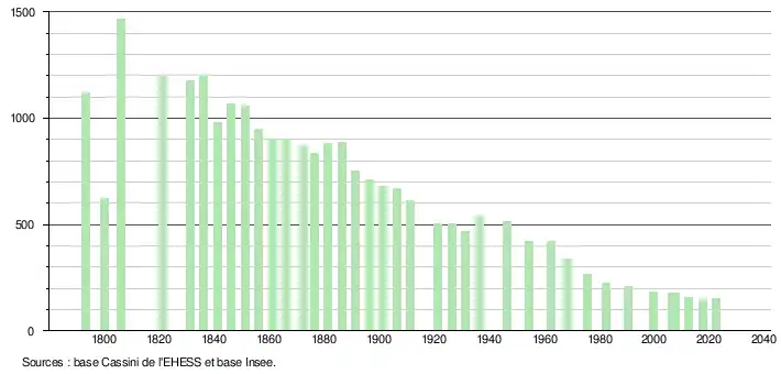 L'évolution du nombre d'habitants est connue à travers les recensements de la population effectués dans la commune depuis 1793. Pour les communes de moins de 10 000 habitants, une enquête de recensement portant sur toute la population est réalisée tous les cinq ans, les populations de référence des années intermédiaires étant quant à elles estimées par interpolation ou extrapolation[16]. Pour la commune, le premier recensement exhaustif entrant dans le cadre du nouveau dispositif a été réalisé en 2007[17].