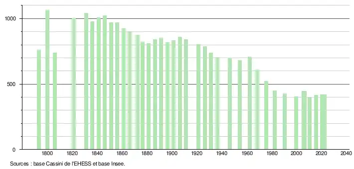 L'évolution du nombre d'habitants est connue à travers les recensements de la population effectués dans la commune depuis 1793. Pour les communes de moins de 10 000 habitants, une enquête de recensement portant sur toute la population est réalisée tous les cinq ans, les populations de référence des années intermédiaires étant quant à elles estimées par interpolation ou extrapolation[26]. Pour la commune, le premier recensement exhaustif entrant dans le cadre du nouveau dispositif a été réalisé en 2005[27].