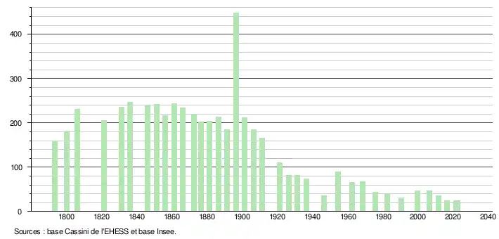 L'évolution du nombre d'habitants est connue à travers les recensements de la population effectués dans la commune depuis 1793. Pour les communes de moins de 10 000 habitants, une enquête de recensement portant sur toute la population est réalisée tous les cinq ans, les populations de référence des années intermédiaires étant quant à elles estimées par interpolation ou extrapolation[45]. Pour la commune, le premier recensement exhaustif entrant dans le cadre du nouveau dispositif a été réalisé en 2006[46].