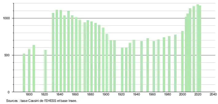L'évolution du nombre d'habitants est connue à travers les recensements de la population effectués dans la commune depuis 1793. Pour les communes de moins de 10 000 habitants, une enquête de recensement portant sur toute la population est réalisée tous les cinq ans, les populations de référence des années intermédiaires étant quant à elles estimées par interpolation ou extrapolation[23]. Pour la commune, le premier recensement exhaustif entrant dans le cadre du nouveau dispositif a été réalisé en 2004[24].