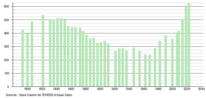 | L'évolution du nombre d'habitants est connue à travers les recensements de la population effectués dans la commune depuis 1793. Pour les communes de moins de 10 000 habitants, une enquête de recensement portant sur toute la population est réalisée tous les cinq ans, les populations de référence des années intermédiaires étant quant à elles estimées par interpolation ou extrapolation[31]. Pour la commune, le premier recensement exhaustif entrant dans le cadre du nouveau dispositif a été réalisé en 2008[32]. En 2022, la commune comptait 624 habitants[Note 6], en évolution de +10,44 % par rapport à 2016 (Lot-et-Garonne : −0,18 %, France hors Mayotte : +2,11 %). |