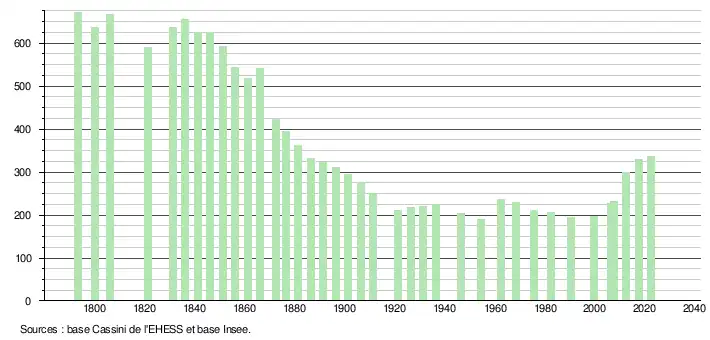 L'évolution du nombre d'habitants est connue à travers les recensements de la population effectués dans la commune depuis 1793. Pour les communes de moins de 10 000 habitants, une enquête de recensement portant sur toute la population est réalisée tous les cinq ans, les populations de référence des années intermédiaires étant quant à elles estimées par interpolation ou extrapolation[26]. Pour la commune, le premier recensement exhaustif entrant dans le cadre du nouveau dispositif a été réalisé en 2007[27].
