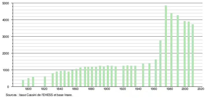 - ↑ Par convention dans Wikipédia, le principe a été retenu de n’afficher dans le tableau des recensements et le graphique, pour les populations légales postérieures à 1999, que les populations correspondant à une enquête exhaustive de recensement pour les communes de moins de 10 000 habitants, et que les populations des années 2006, 2011, 2016, etc. pour les communes de plus de 10 000 habitants, ainsi que la dernière population légale publiée par l’Insee pour l'ensemble des communes.
