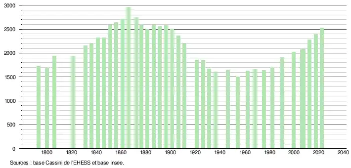 L'évolution du nombre d'habitants est connue à travers les recensements de la population effectués dans la commune depuis 1793. Pour les communes de moins de 10 000 habitants, une enquête de recensement portant sur toute la population est réalisée tous les cinq ans, les populations de référence des années intermédiaires étant quant à elles estimées par interpolation ou extrapolation[20]. Pour la commune, le premier recensement exhaustif entrant dans le cadre du nouveau dispositif a été réalisé en 2007[21].