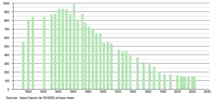 L'évolution du nombre d'habitants est connue à travers les recensements de la population effectués dans la commune depuis 1793. Pour les communes de moins de 10 000 habitants, une enquête de recensement portant sur toute la population est réalisée tous les cinq ans, les populations de référence des années intermédiaires étant quant à elles estimées par interpolation ou extrapolation[17]. Pour la commune, le premier recensement exhaustif entrant dans le cadre du nouveau dispositif a été réalisé en 2004[18].