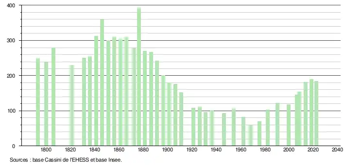 L'évolution du nombre d'habitants est connue à travers les recensements de la population effectués dans la commune depuis 1793. Pour les communes de moins de 10 000 habitants, une enquête de recensement portant sur toute la population est réalisée tous les cinq ans, les populations de référence des années intermédiaires étant quant à elles estimées par interpolation ou extrapolation[17]. Pour la commune, le premier recensement exhaustif entrant dans le cadre du nouveau dispositif a été réalisé en 2008[18].