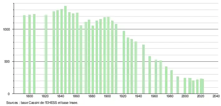L'évolution du nombre d'habitants est connue à travers les recensements de la population effectués dans la commune depuis 1793. Pour les communes de moins de 10 000 habitants, une enquête de recensement portant sur toute la population est réalisée tous les cinq ans, les populations de référence des années intermédiaires étant quant à elles estimées par interpolation ou extrapolation[16]. Pour la commune, le premier recensement exhaustif entrant dans le cadre du nouveau dispositif a été réalisé en 2005[17].