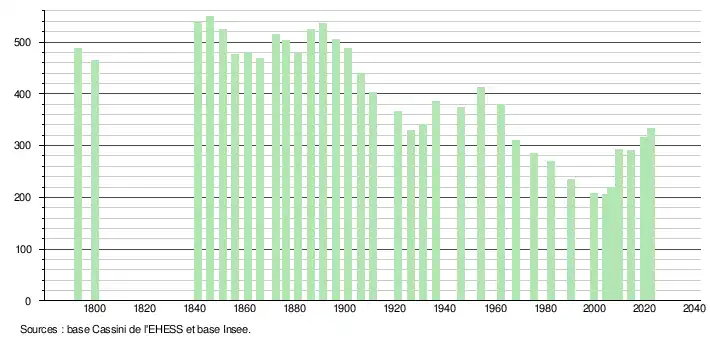 L'évolution du nombre d'habitants est connue à travers les recensements de la population effectués dans la commune depuis 1793. Pour les communes de moins de 10 000 habitants, une enquête de recensement portant sur toute la population est réalisée tous les cinq ans, les populations de référence des années intermédiaires étant quant à elles estimées par interpolation ou extrapolation[45]. Pour la commune, le premier recensement exhaustif entrant dans le cadre du nouveau dispositif a été réalisé en 2004[46].