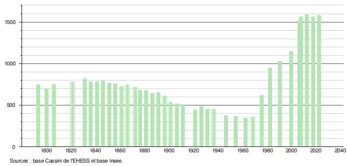 L'évolution du nombre d'habitants est connue à travers les recensements de la population effectués dans la commune depuis 1793. Pour les communes de moins de 10 000 habitants, une enquête de recensement portant sur toute la population est réalisée tous les cinq ans, les populations de référence des années intermédiaires étant quant à elles estimées par interpolation ou extrapolation[18]. Pour la commune, le premier recensement exhaustif entrant dans le cadre du nouveau dispositif a été réalisé en 2007[19].