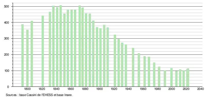 L'évolution du nombre d'habitants est connue à travers les recensements de la population effectués dans la commune depuis 1793. Pour les communes de moins de 10 000 habitants, une enquête de recensement portant sur toute la population est réalisée tous les cinq ans, les populations de référence des années intermédiaires étant quant à elles estimées par interpolation ou extrapolation[14]. Pour la commune, le premier recensement exhaustif entrant dans le cadre du nouveau dispositif a été réalisé en 2006[15].