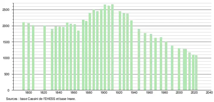 L'évolution du nombre d'habitants est connue à travers les recensements de la population effectués dans la commune depuis 1793. Pour les communes de moins de 10 000 habitants, une enquête de recensement portant sur toute la population est réalisée tous les cinq ans, les populations de référence des années intermédiaires étant quant à elles estimées par interpolation ou extrapolation[15]. Pour la commune, le premier recensement exhaustif entrant dans le cadre du nouveau dispositif a été réalisé en 2008[16].