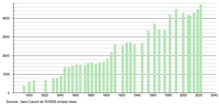 L'évolution du nombre d'habitants est connue à travers les recensements de la population effectués dans la commune depuis 1793. Pour les communes de moins de 10 000 habitants, une enquête de recensement portant sur toute la population est réalisée tous les cinq ans, les populations de référence des années intermédiaires étant quant à elles estimées par interpolation ou extrapolation[25]. Pour la commune, le premier recensement exhaustif entrant dans le cadre du nouveau dispositif a été réalisé en 2008[26].