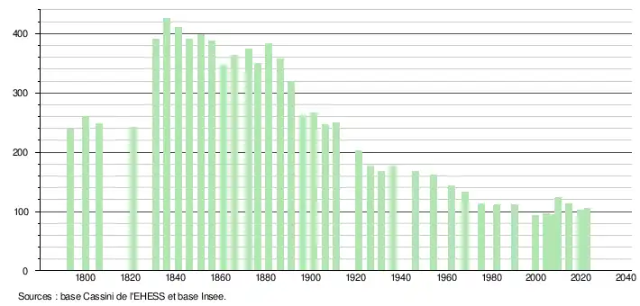 L'évolution du nombre d'habitants est connue à travers les recensements de la population effectués dans la commune depuis 1793. Pour les communes de moins de 10 000 habitants, une enquête de recensement portant sur toute la population est réalisée tous les cinq ans, les populations de référence des années intermédiaires étant quant à elles estimées par interpolation ou extrapolation[21]. Pour la commune, le premier recensement exhaustif entrant dans le cadre du nouveau dispositif a été réalisé en 2004[22].