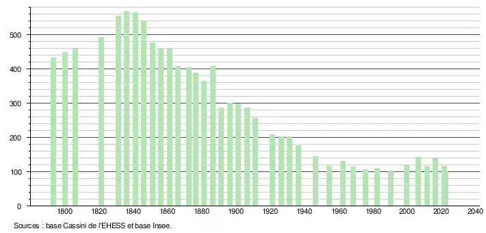 L'évolution du nombre d'habitants est connue à travers les recensements de la population effectués dans la commune depuis 1793. Pour les communes de moins de 10 000 habitants, une enquête de recensement portant sur toute la population est réalisée tous les cinq ans, les populations de référence des années intermédiaires étant quant à elles estimées par interpolation ou extrapolation[30]. Pour la commune, le premier recensement exhaustif entrant dans le cadre du nouveau dispositif a été réalisé en 2006[31].