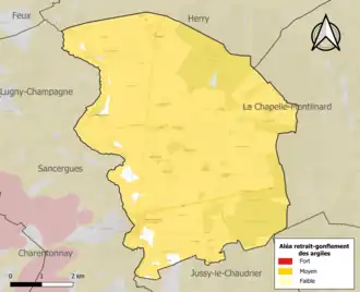 Le retrait-gonflement des sols argileux est susceptible d'engendrer des dommages importants aux bâtiments en cas d’alternance de périodes de sécheresse et de pluie. 97,9 % de la superficie communale est en aléa moyen ou fort (90 % au niveau départemental et 48,5 % au niveau national). Sur les 225 bâtiments dénombrés sur la commune en 2019, 222 sont en aléa moyen ou fort, soit 99 %, à comparer aux 83 % au niveau départemental et 54 % au niveau national. Une cartographie de l'exposition du territoire national au retrait gonflement des sols argileux est disponible sur le site du BRGM[14],[Carte 2].