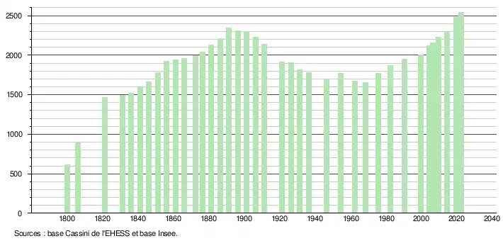 L'évolution du nombre d'habitants est connue à travers les recensements de la population effectués dans la commune depuis 1800. Pour les communes de moins de 10 000 habitants, une enquête de recensement portant sur toute la population est réalisée tous les cinq ans, les populations de référence des années intermédiaires étant quant à elles estimées par interpolation ou extrapolation[20]. Pour la commune, le premier recensement exhaustif entrant dans le cadre du nouveau dispositif a été réalisé en 2004[21].
