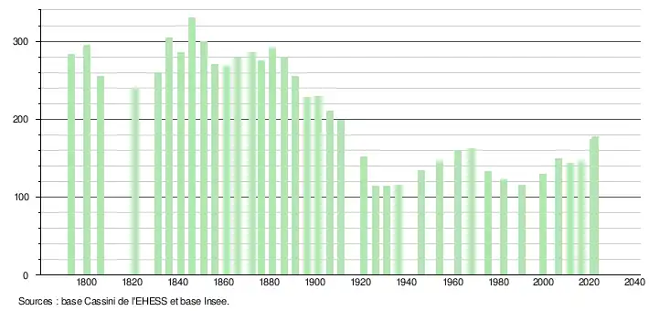 L'évolution du nombre d'habitants est connue à travers les recensements de la population effectués dans la commune depuis 1793. Pour les communes de moins de 10 000 habitants, une enquête de recensement portant sur toute la population est réalisée tous les cinq ans, les populations de référence des années intermédiaires étant quant à elles estimées par interpolation ou extrapolation[15]. Pour la commune, le premier recensement exhaustif entrant dans le cadre du nouveau dispositif a été réalisé en 2006[16].