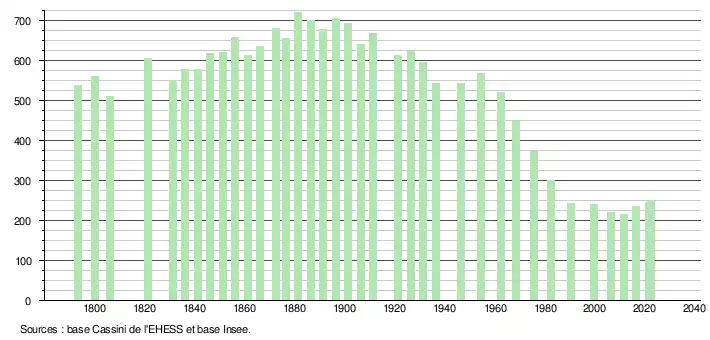 L'évolution du nombre d'habitants est connue à travers les recensements de la population effectués dans la commune depuis 1793. Pour les communes de moins de 10 000 habitants, une enquête de recensement portant sur toute la population est réalisée tous les cinq ans, les populations de référence des années intermédiaires étant quant à elles estimées par interpolation ou extrapolation[20]. Pour la commune, le premier recensement exhaustif entrant dans le cadre du nouveau dispositif a été réalisé en 2006[21].