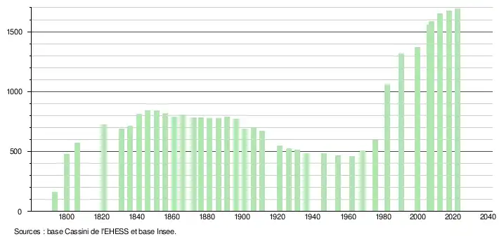 L'évolution du nombre d'habitants est connue à travers les recensements de la population effectués dans la commune depuis 1793. Pour les communes de moins de 10 000 habitants, une enquête de recensement portant sur toute la population est réalisée tous les cinq ans, les populations de référence des années intermédiaires étant quant à elles estimées par interpolation ou extrapolation[30]. Pour la commune, le premier recensement exhaustif entrant dans le cadre du nouveau dispositif a été réalisé en 2007[31].